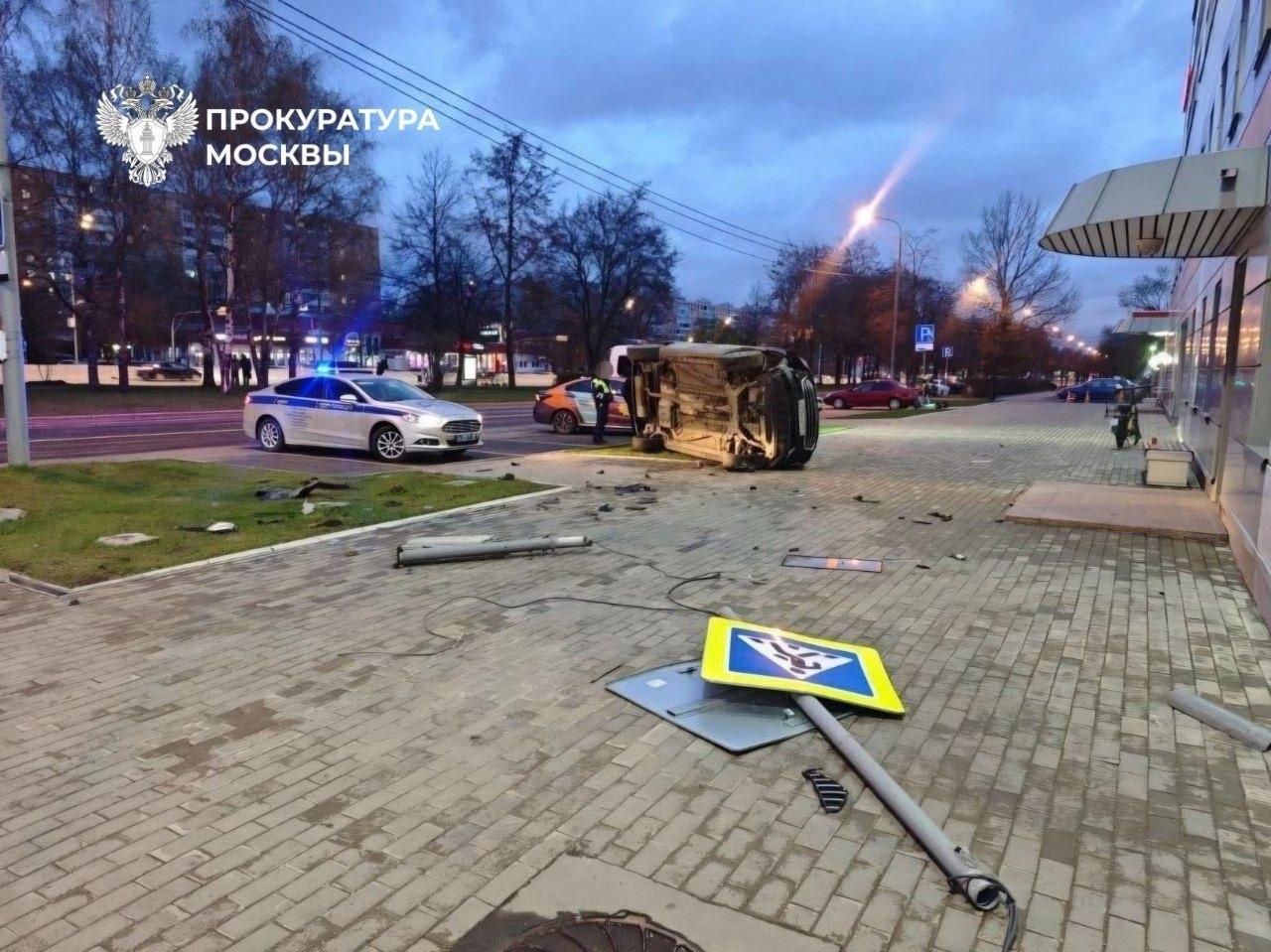 На кадрах с места аварии видно, что машина сильно повреждена и лежит на боку, а тротуар усыпан обломками.