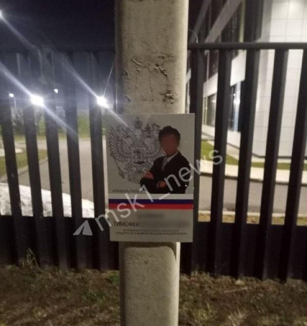 Неизвестные лица разместили провокационный плакат на заборе у школы в подмосковном Одинцово, где в декабре 2025 года произошло убийство четвероклассника. На табличке изображен 15-летний Тимофей К., обвиняемый в преступлении, в деловом костюме на фоне герба и флага России. Подпись под фотографией гласит: «Гордость России. За преданность идеалам межнациональной солидарности и активную общественную деятельность».