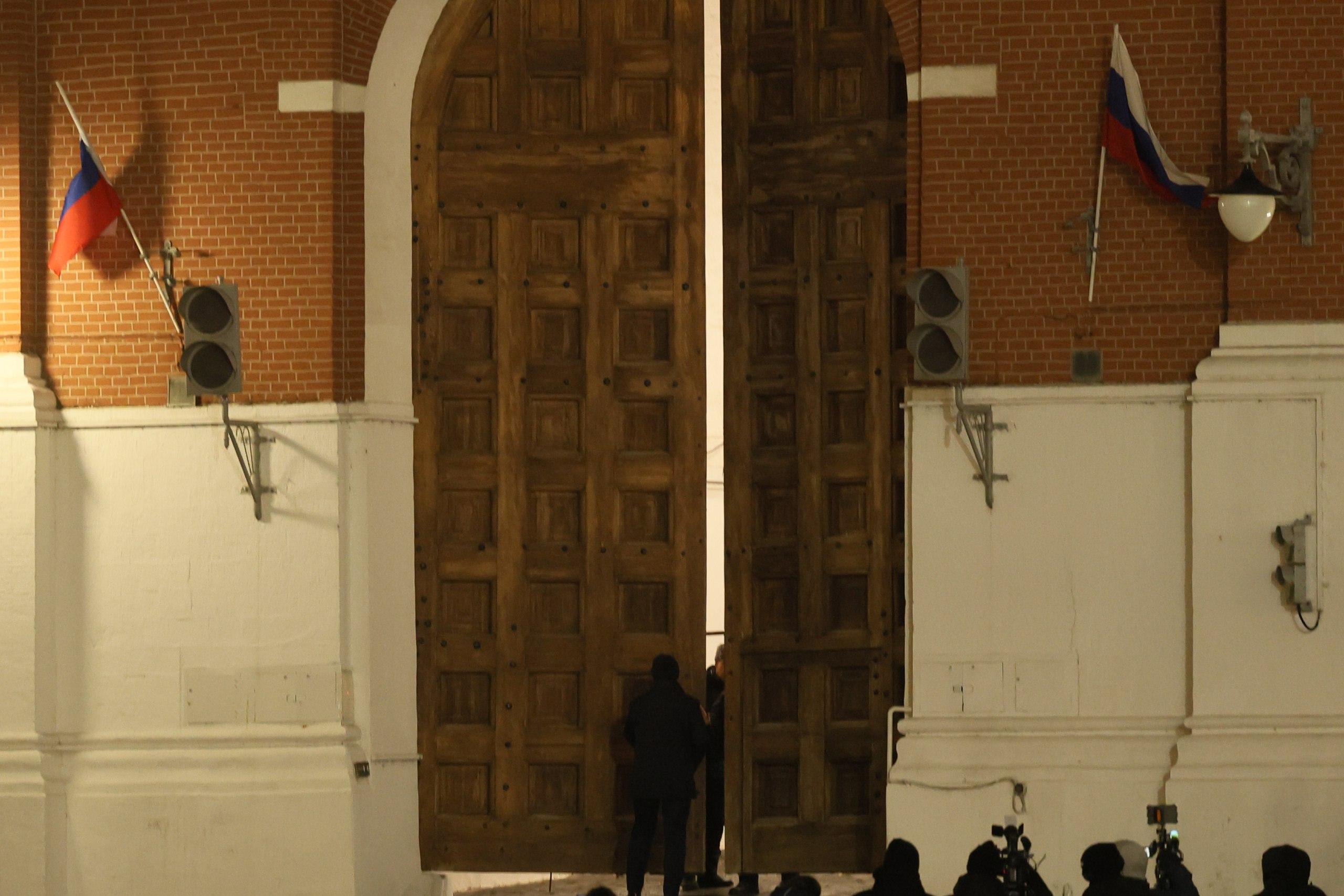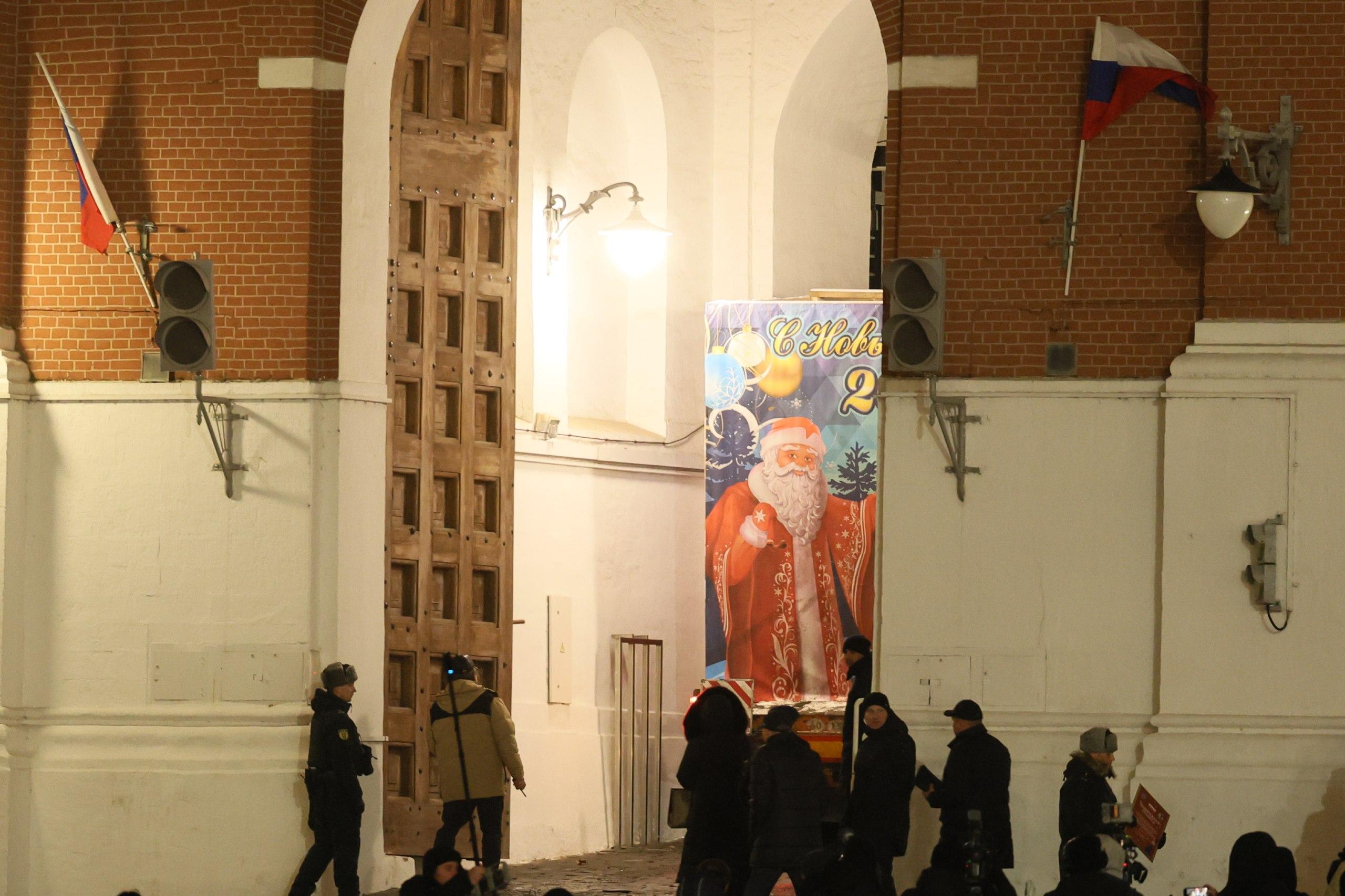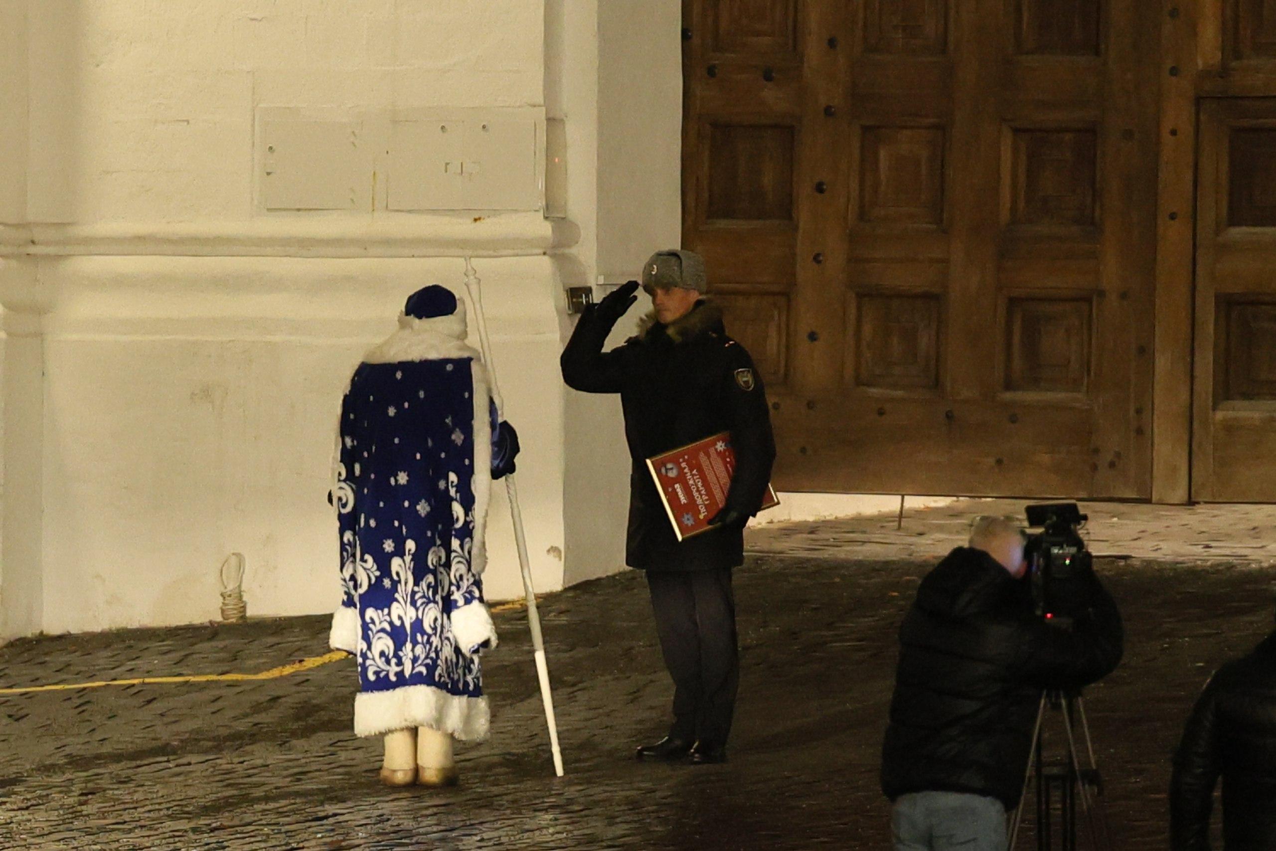 Дед Мороз вручил «Подорожную грамоту» коменданту Кремля. Спецтранспорт с елью въехал на территорию ровно в 22:00 по московскому времени, под бой курантов.
