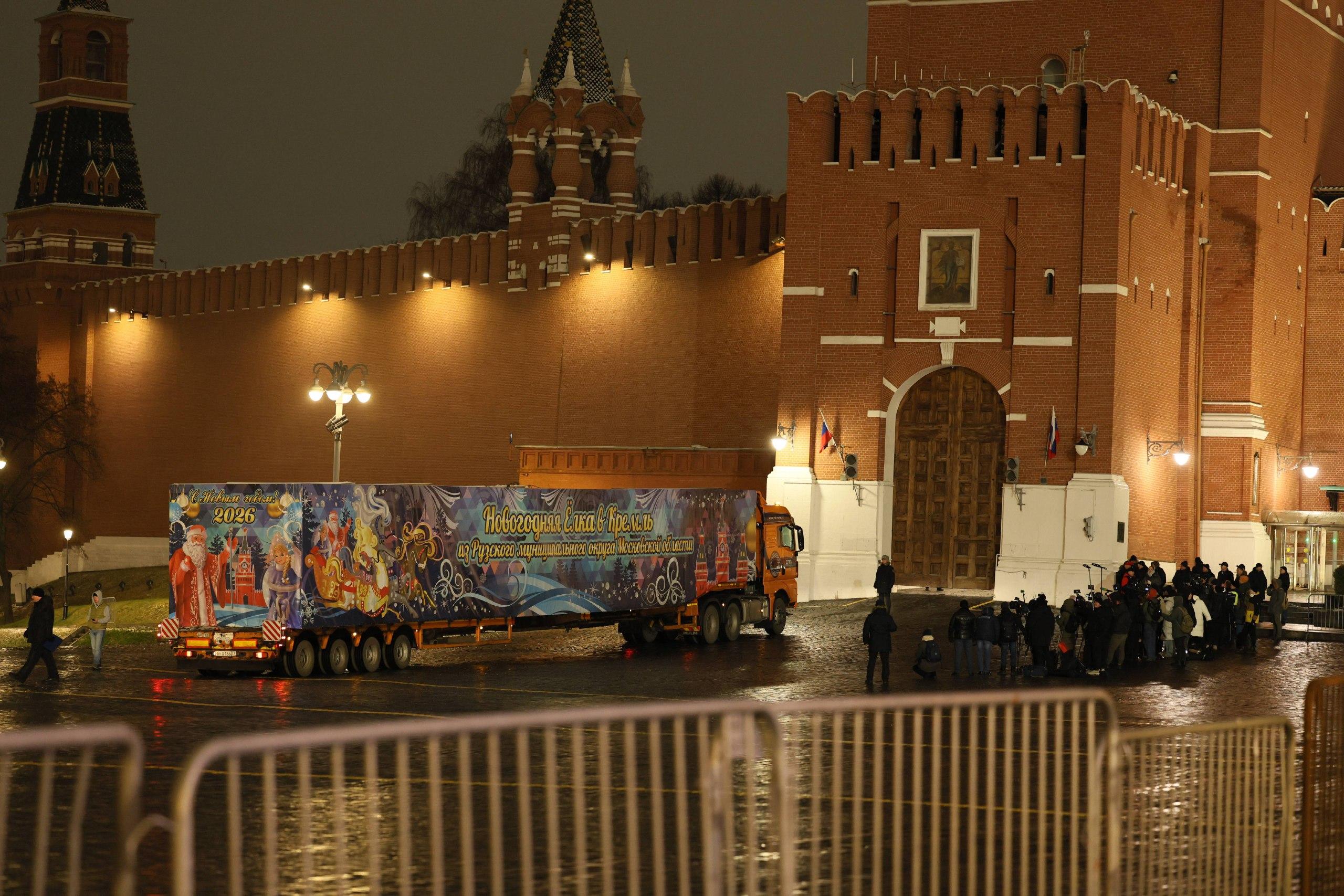 Главную елку страны доставили в Кремль, перекрыв Красную площадь
