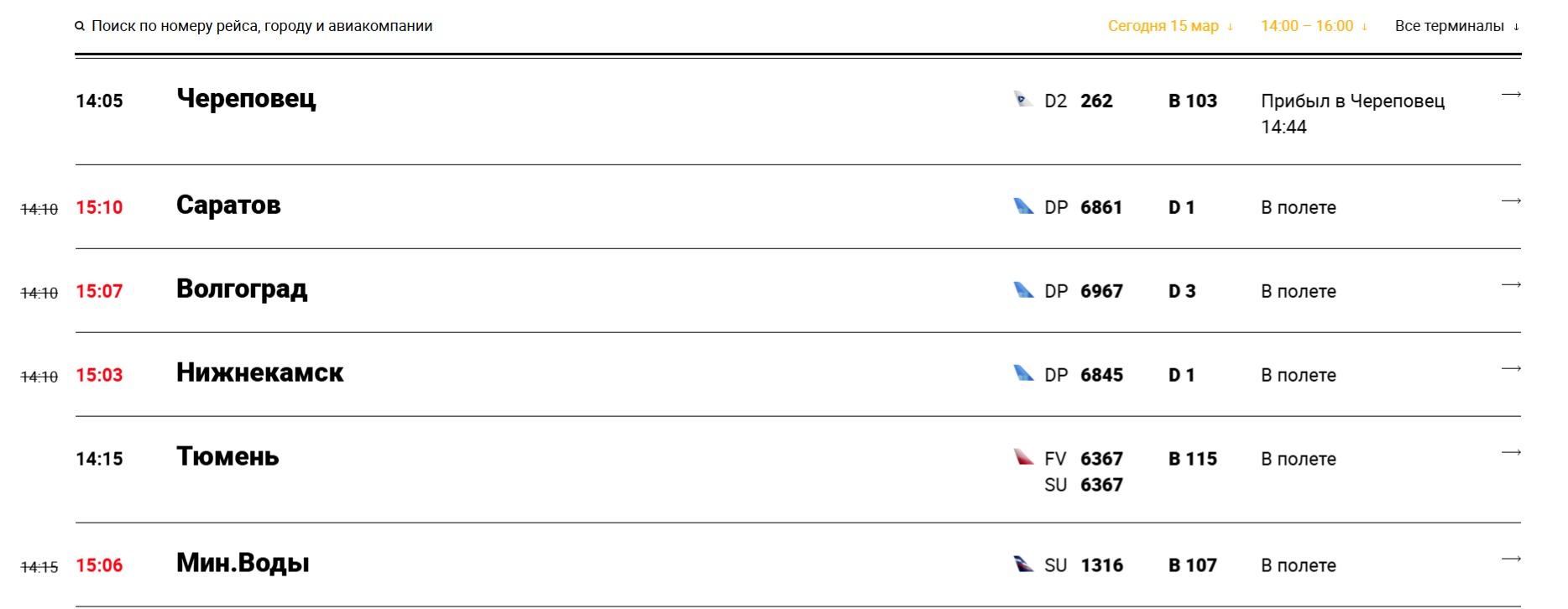 Например, рейс из Шереметьево в Саратов, запланированный на 14:10, отправился с опозданием на час. Также задержались вылеты в Волгоград, Нижнекамск, Мурманск и Минеральные Воды. Самолёт в Калининград, который должен был вылететь в 15:05, теперь отправится из Москвы в 17:40.
