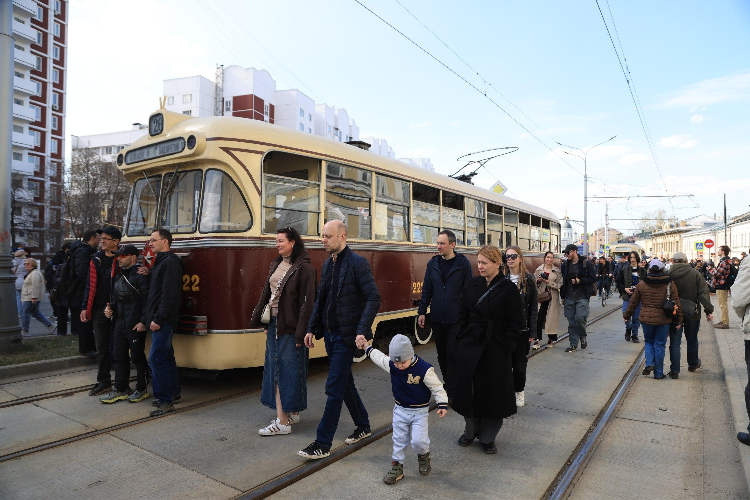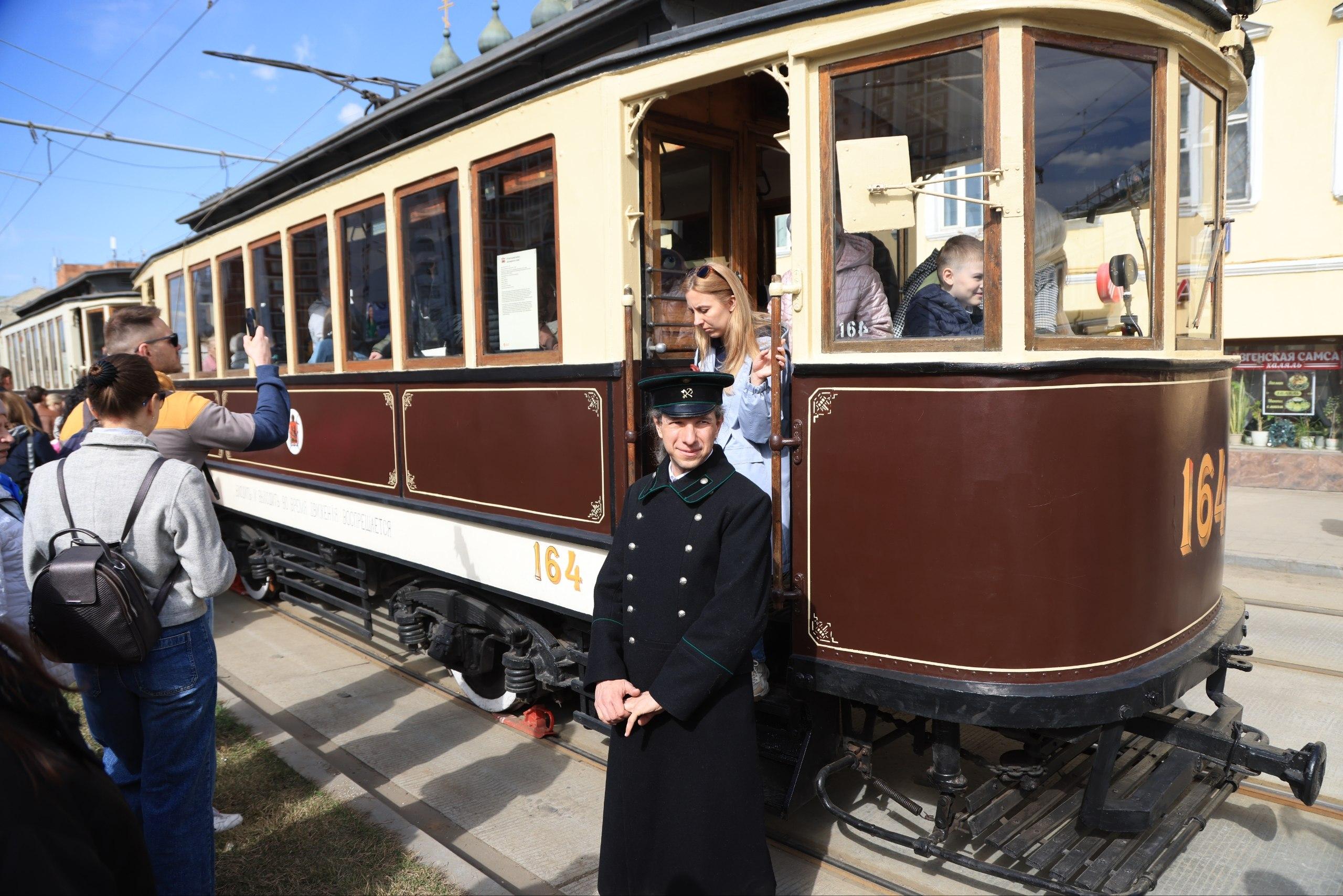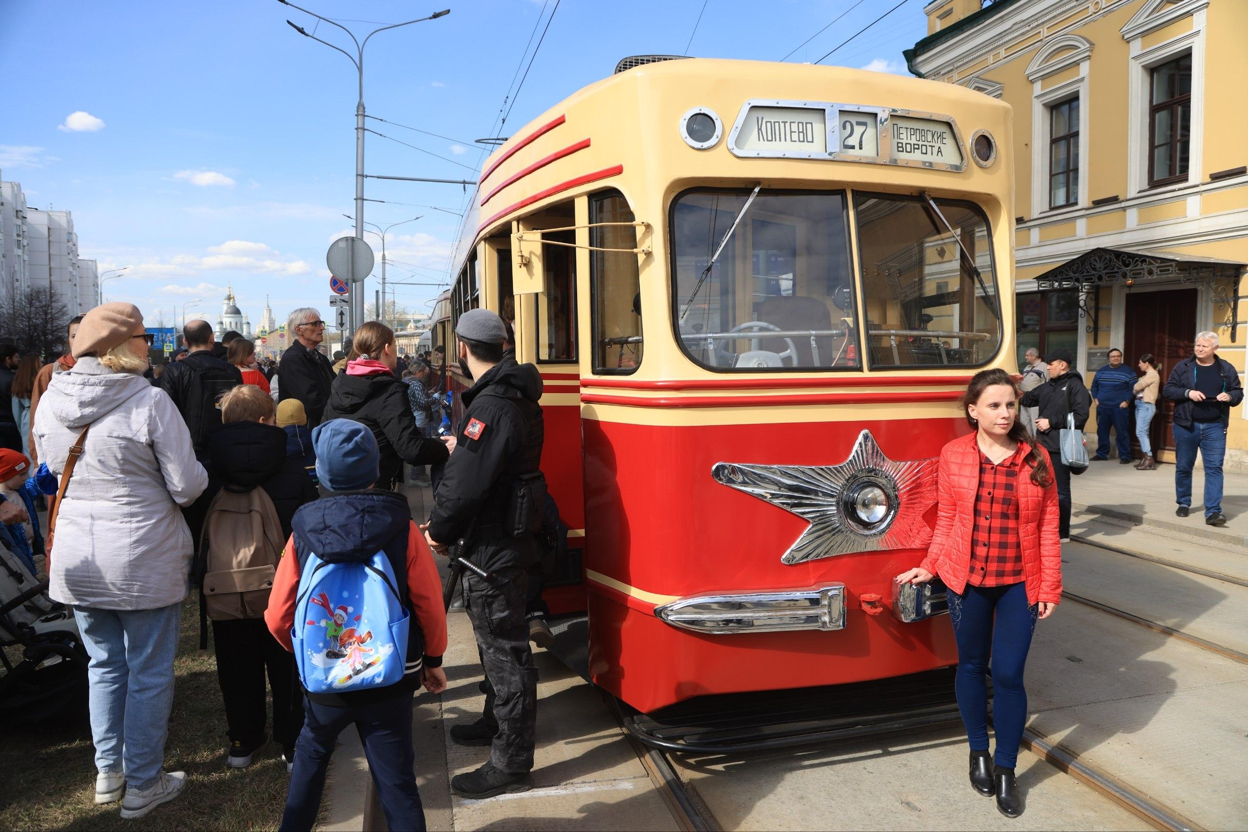Мероприятие приурочено к 127-летию московского трамвая. Многие семьи пришли с детьми, которые с интересом изучали транспорт прошлого.