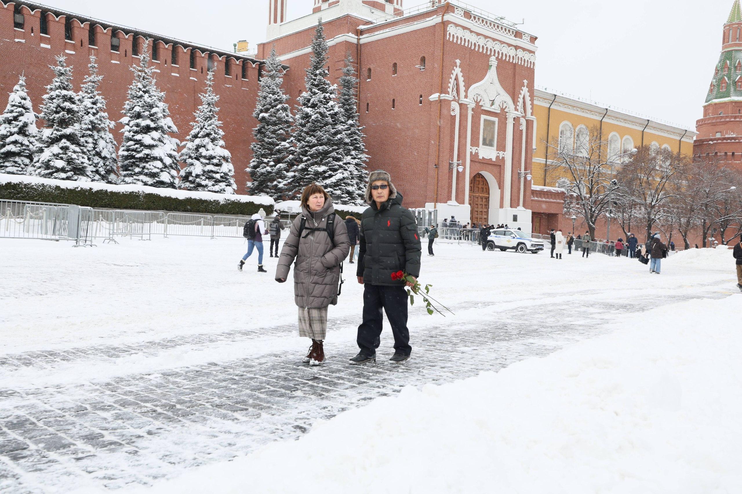 Местные жители осторожно преодолевают обледенелые ступеньки, в то время как туристы охотно фотографируются на фоне заснеженного Кремля.