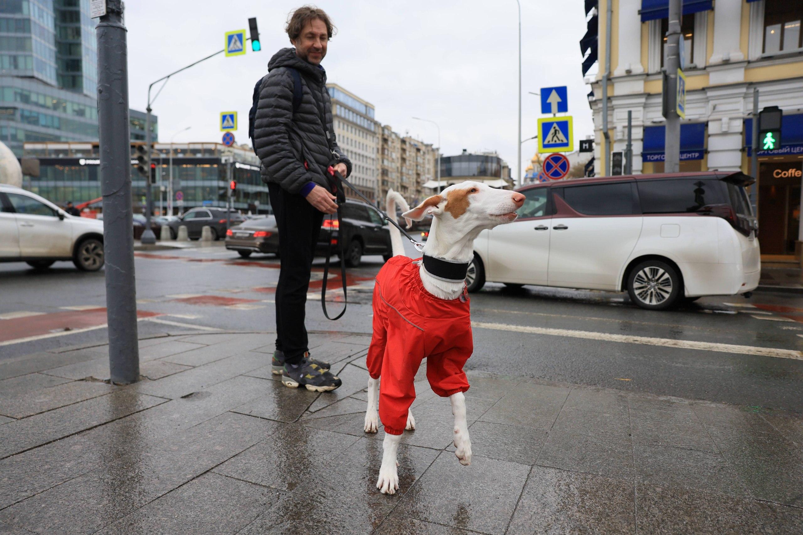 Владельцы домашних животных также вышли на прогулку со своими питомцами, используя для защиты стильные непромокаемые накидки.