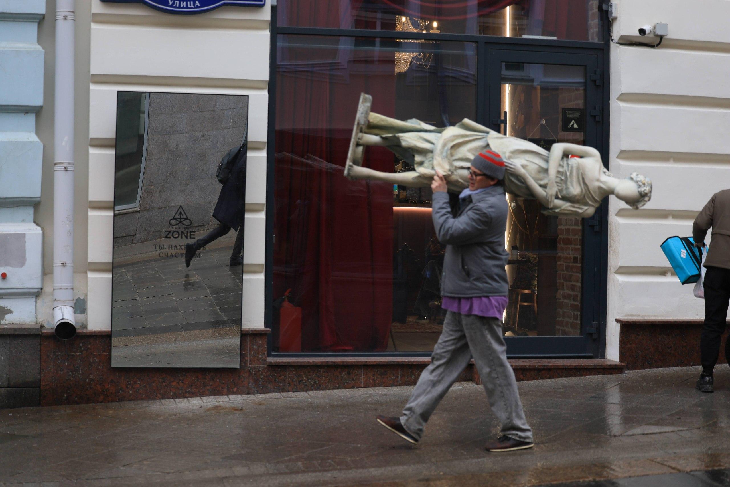 Жители Москвы укрывались от дождя под зонтами, в то время как коммунальные службы продолжали полив городских магистралей.