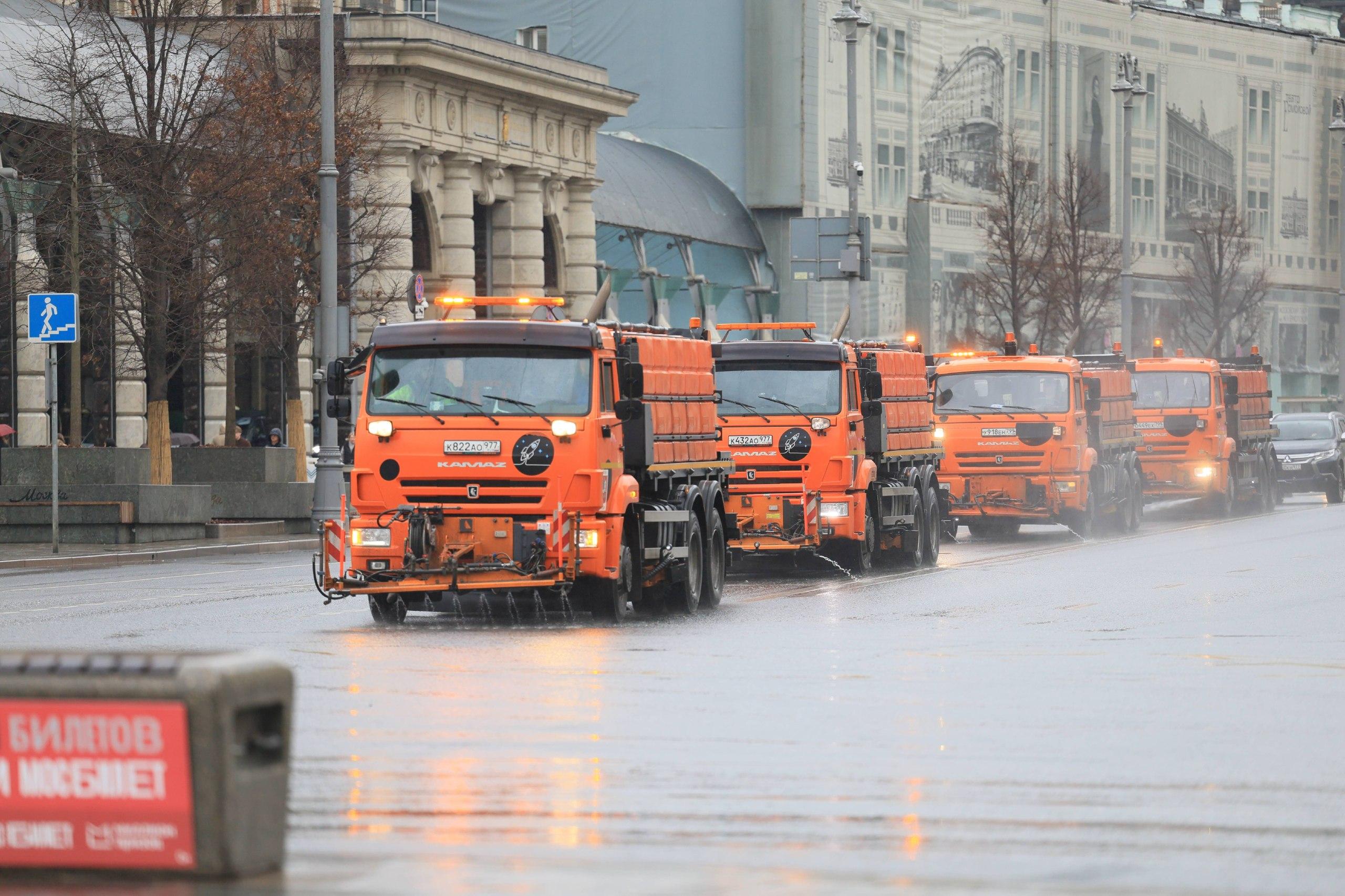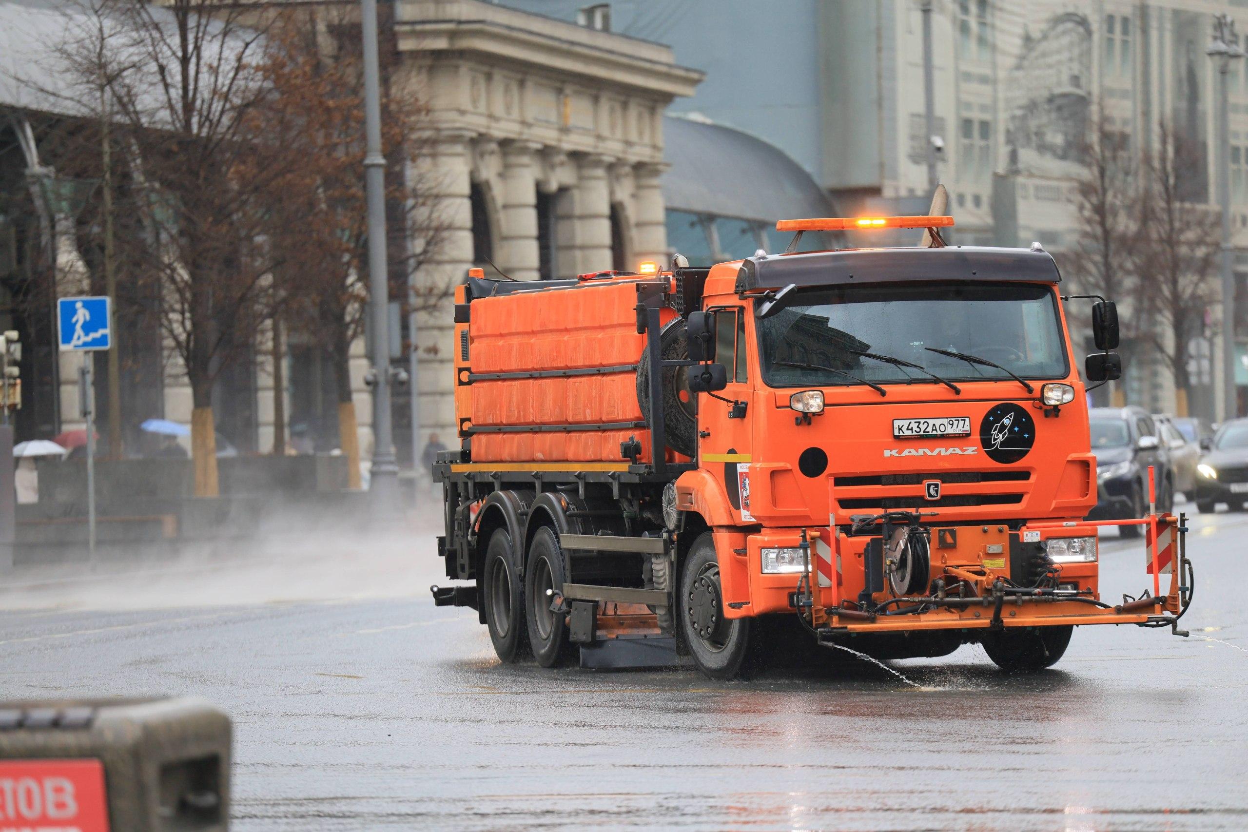 В понедельник, 6 апреля, над столицей прошёл сильный дождь. Однако непогода не помешала коммунальным службам выполнить запланированные работы по поливу дорожного покрытия.