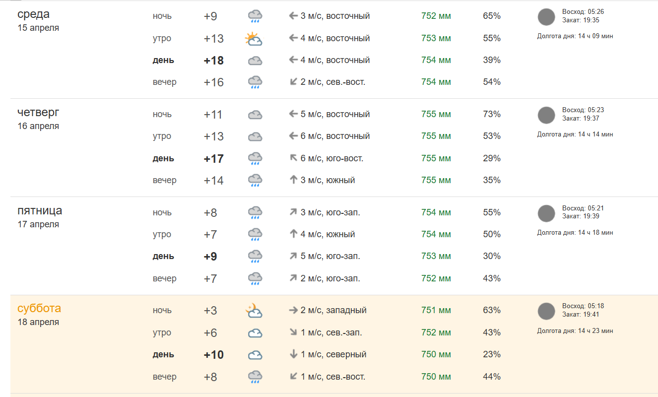 Согласно данным сервиса «Погода.MSK1», в среду и четверг, 15–16 апреля, в Москве потеплеет до +17-18 °C. «Яндекс.Погода» прогнозирует на эти дни +14-16 °C, в пятницу, 17 апреля — +17 °C, а на выходных — +15 °C. По информации Gismeteo, в четверг температура составит +20 °C, в пятницу и выходные — 18-19 °C.