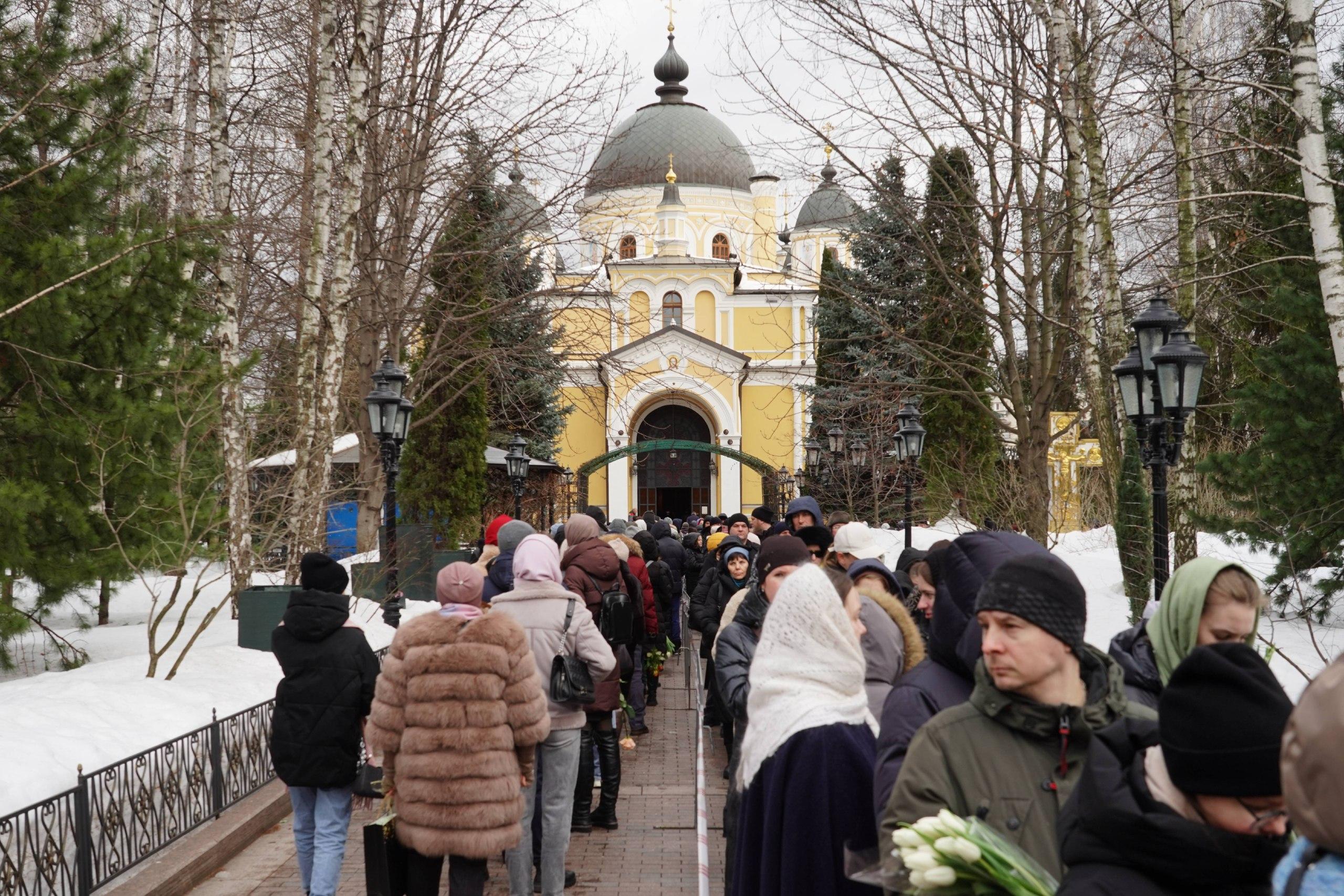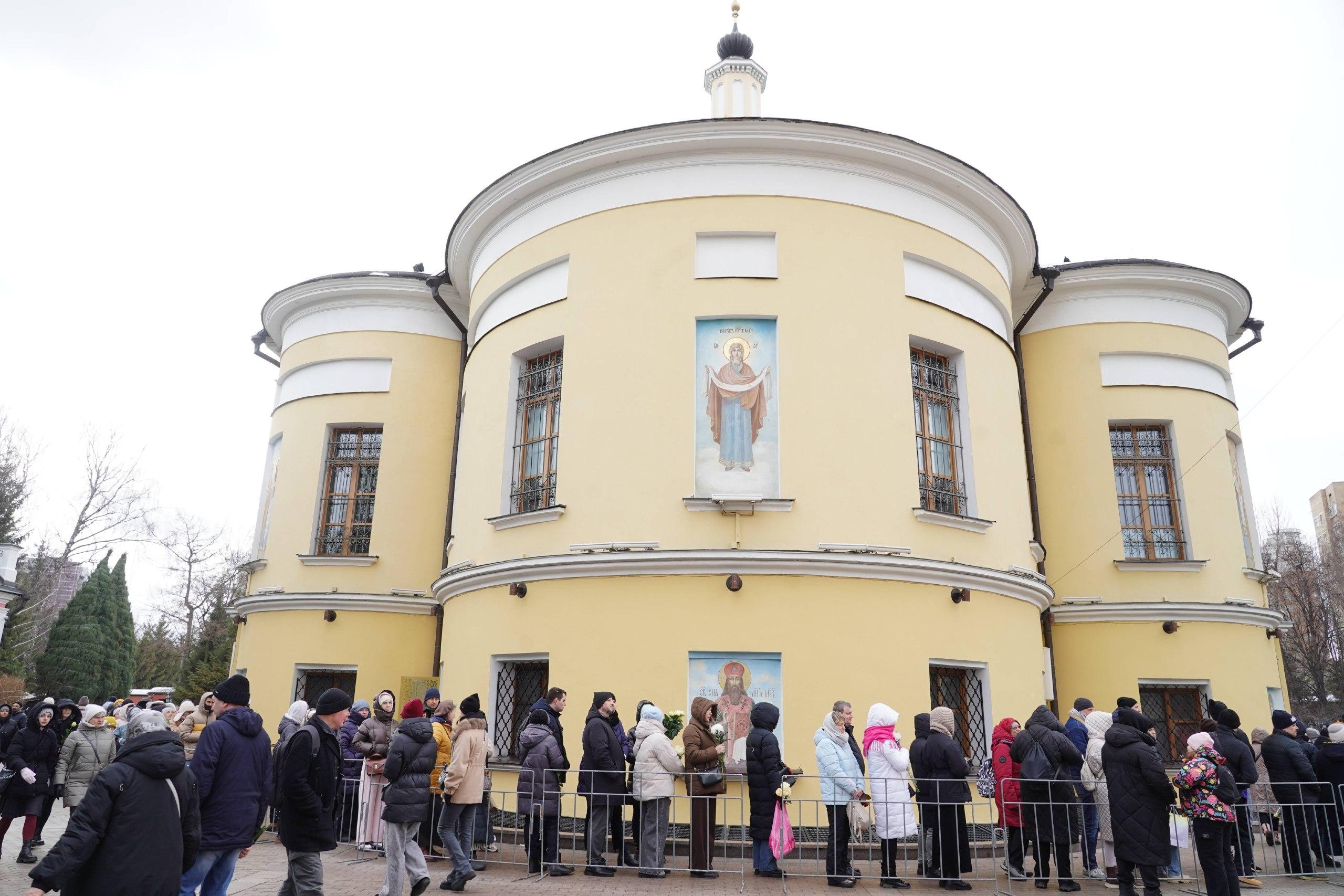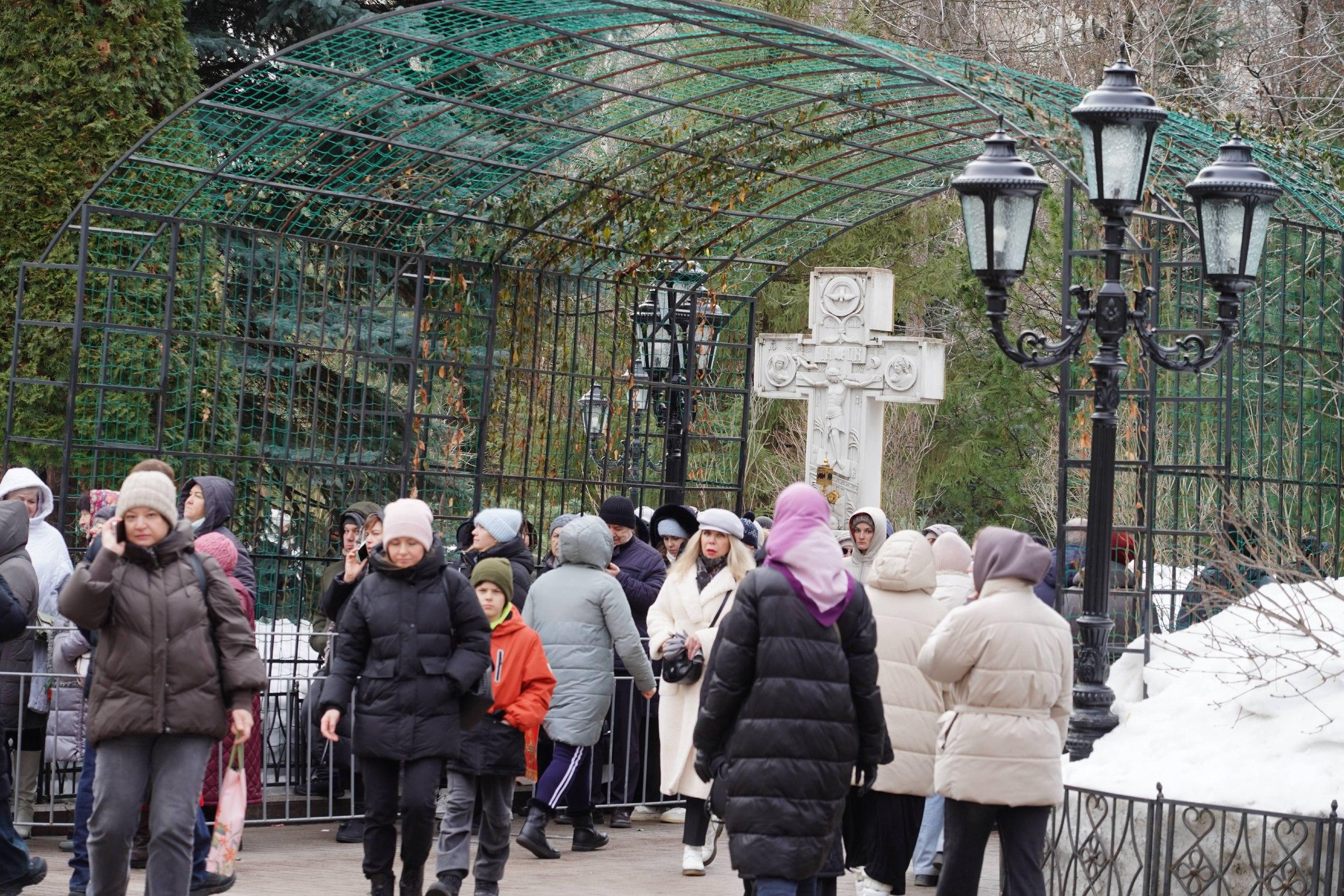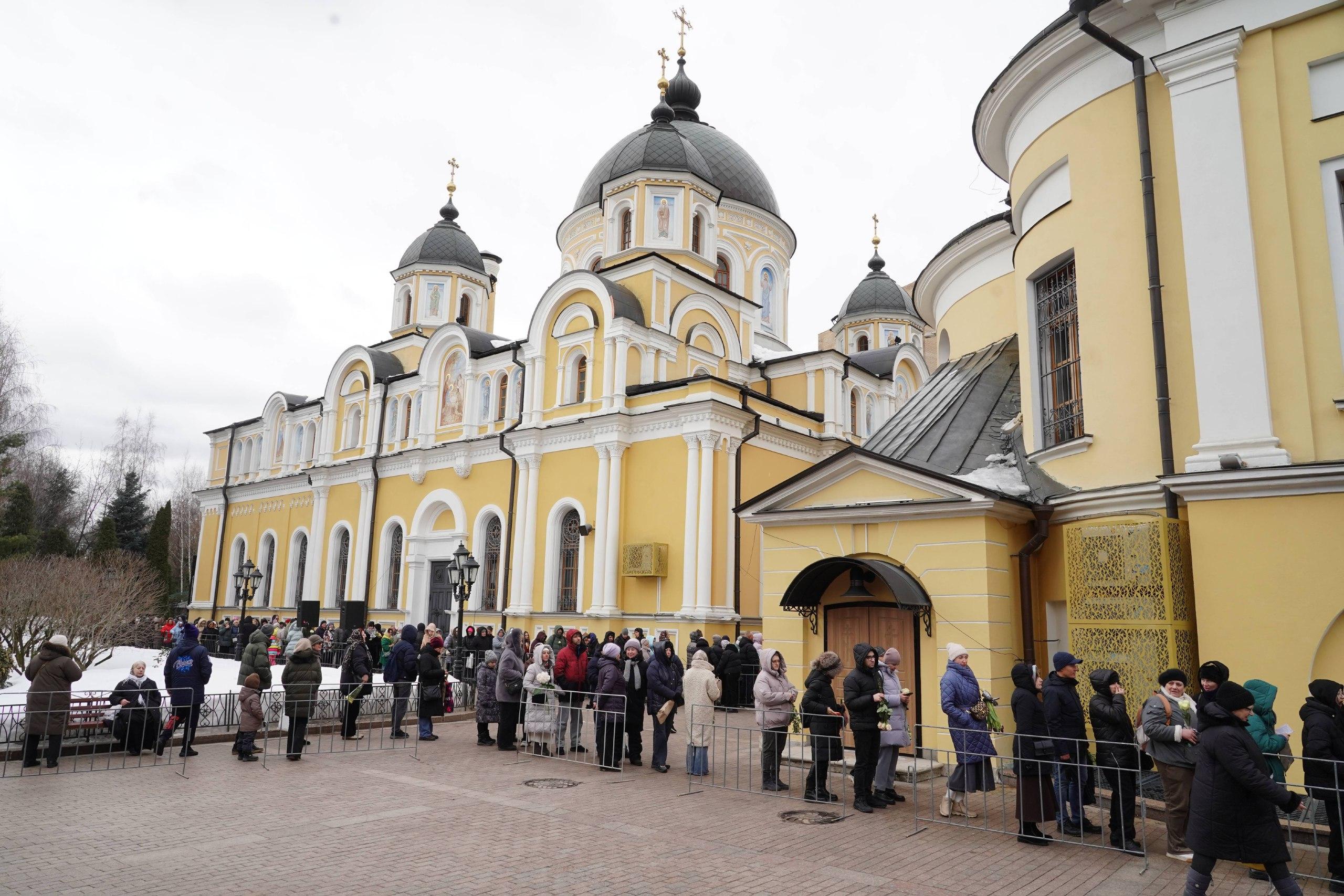 Сотни, а возможно, и тысячи человек окружили храм. Очередь вышла за пределы монастырской территории, многие пришедшие держат в руках цветы.