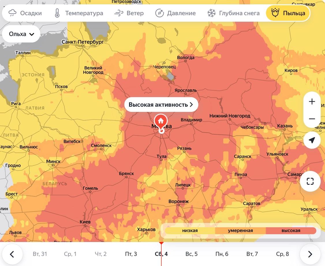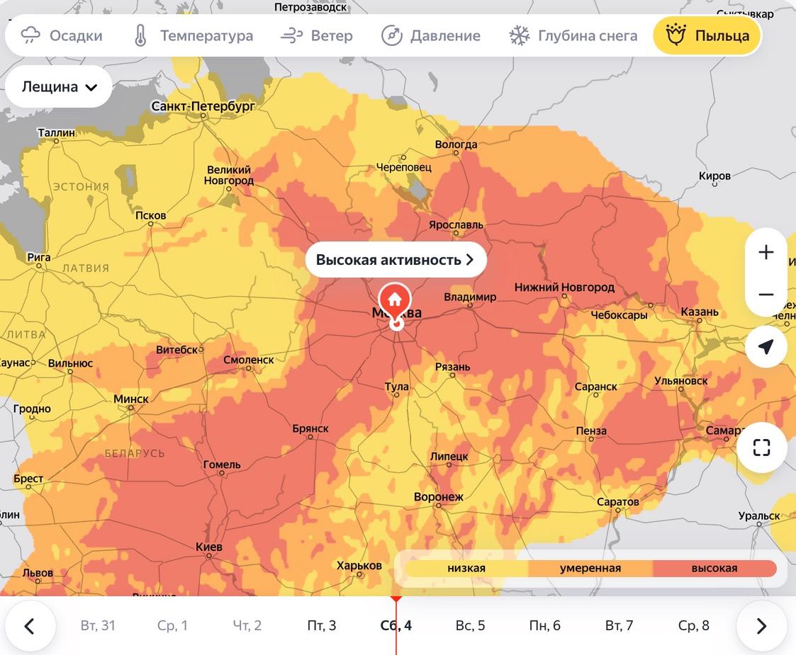Сезон аллергий традиционно начинается в середине апреля, но в этом году из-за аномально теплой погоды цветение стартовало раньше. По данным «Яндекс Погоды», уже 3 апреля столицу накроет облако пыльцы.