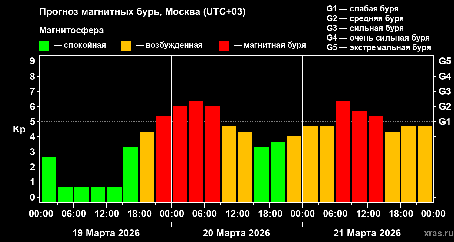Наиболее интенсивные магнитные бури ожидаются 20 и 21 марта 2026 года.