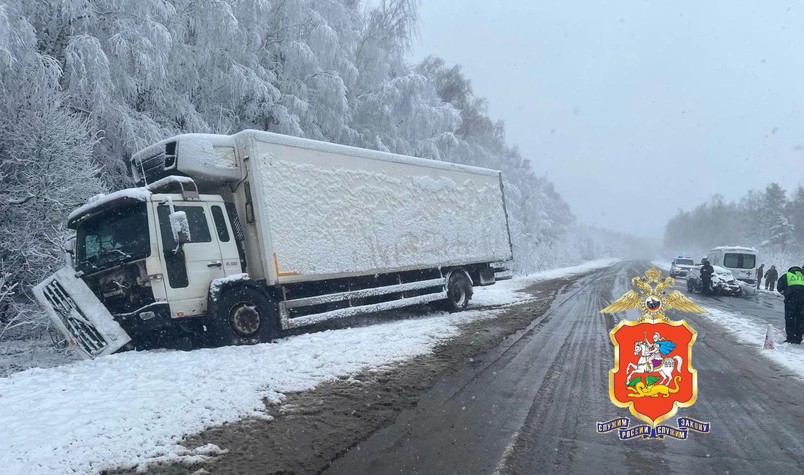 В Подмосковье в результате столкновения легковушки с фурой погибли два человека. Авария произошла на фоне сильного снегопада.