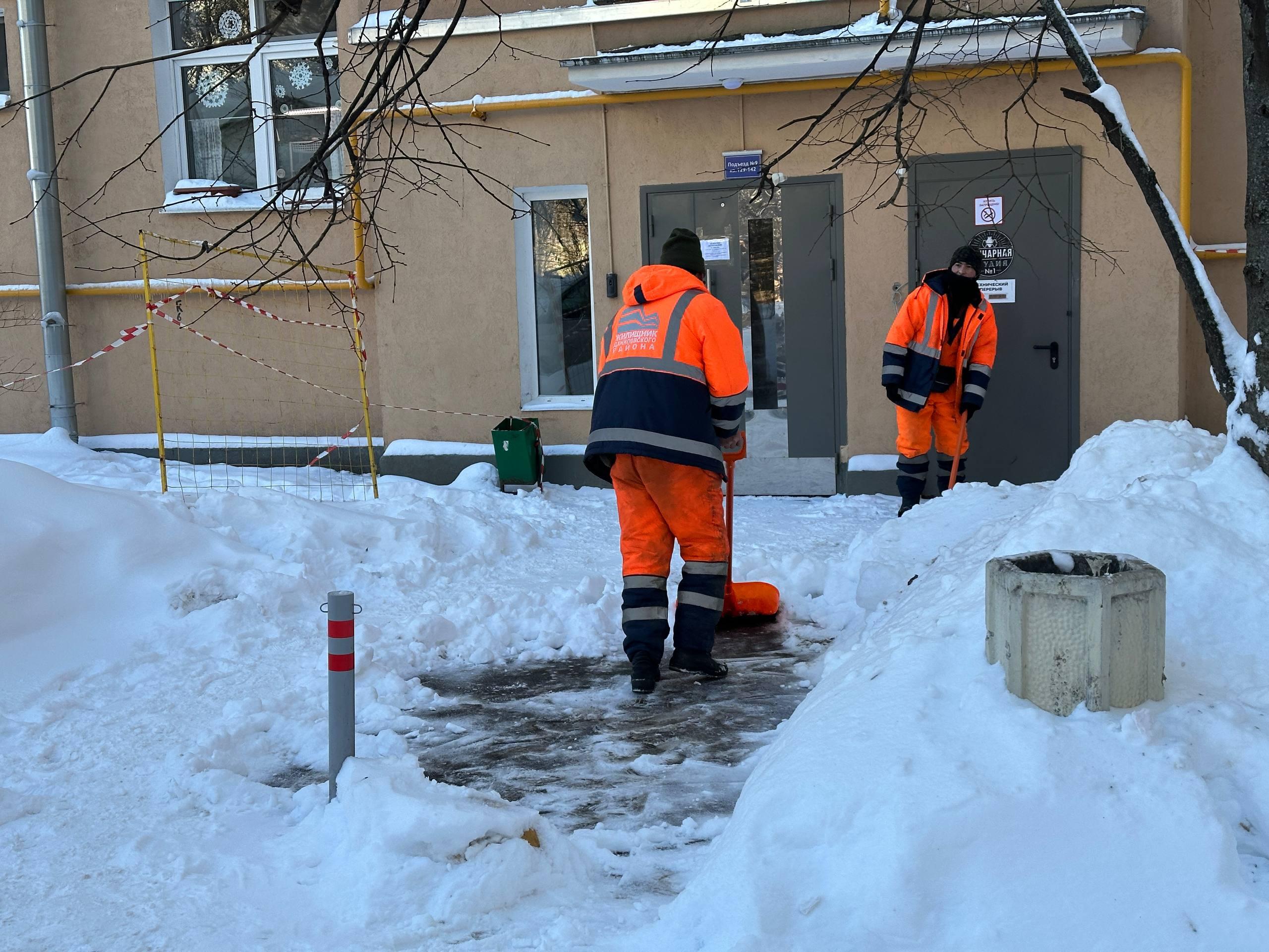 Тем временем во дворе продолжаются работы: дворники лопатами расчищают снег на подъездных дорожках.