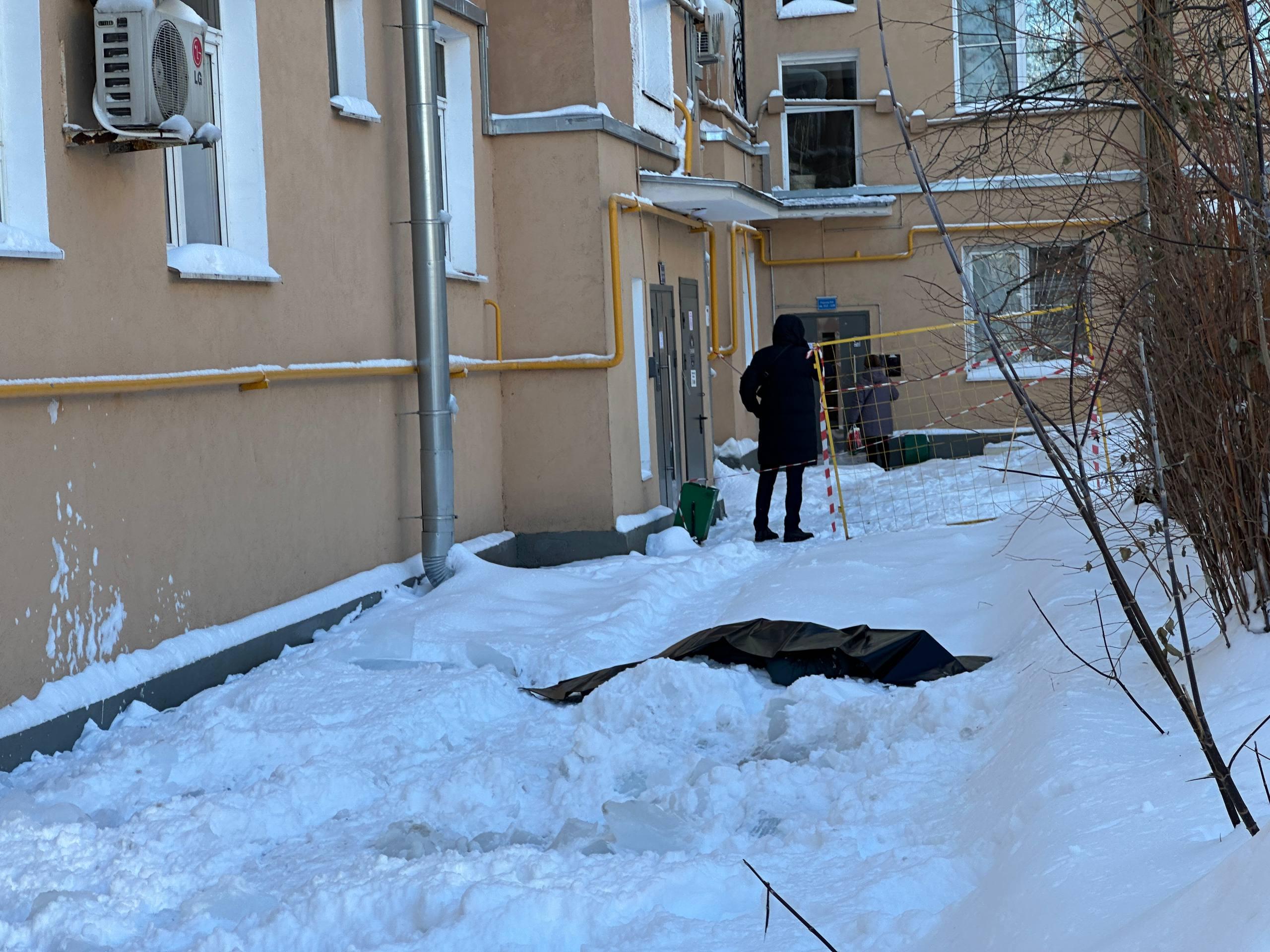 В настоящее время на месте работают экстренные службы и криминалисты. Зону, где ранее сбивали снег и лёд с крыши, огородили сигнальной лентой.