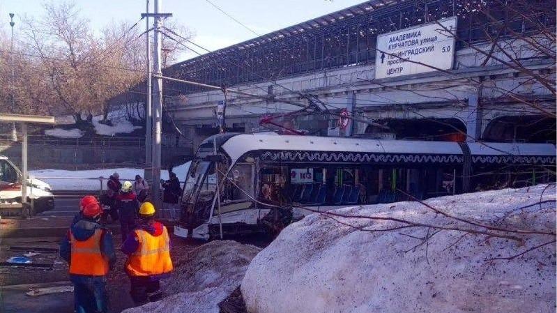 На снимке запечатлены два трамвая после столкновения на северо-западе Москвы.