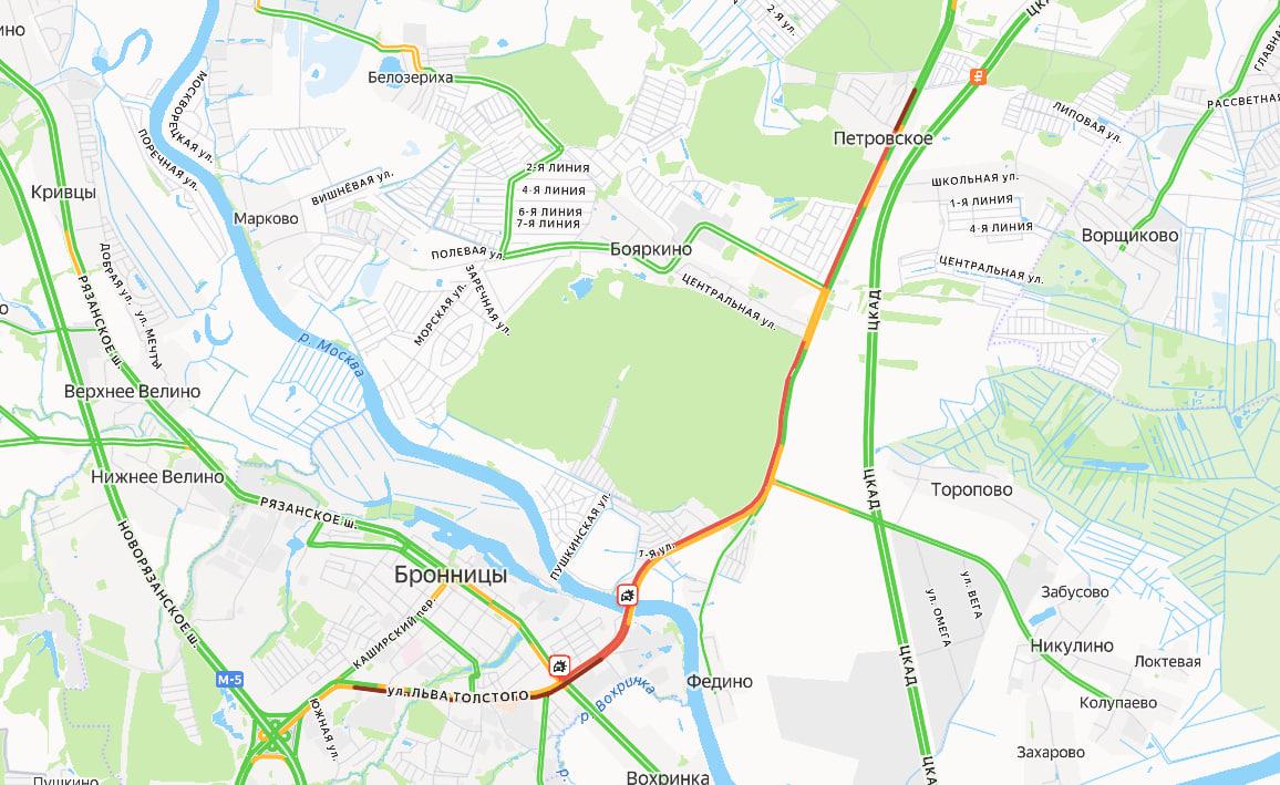 Движение на Бронницком мосту полностью перекрыто после лобового столкновения двух большегрузов, водители застряли в многокилометровой пробке.