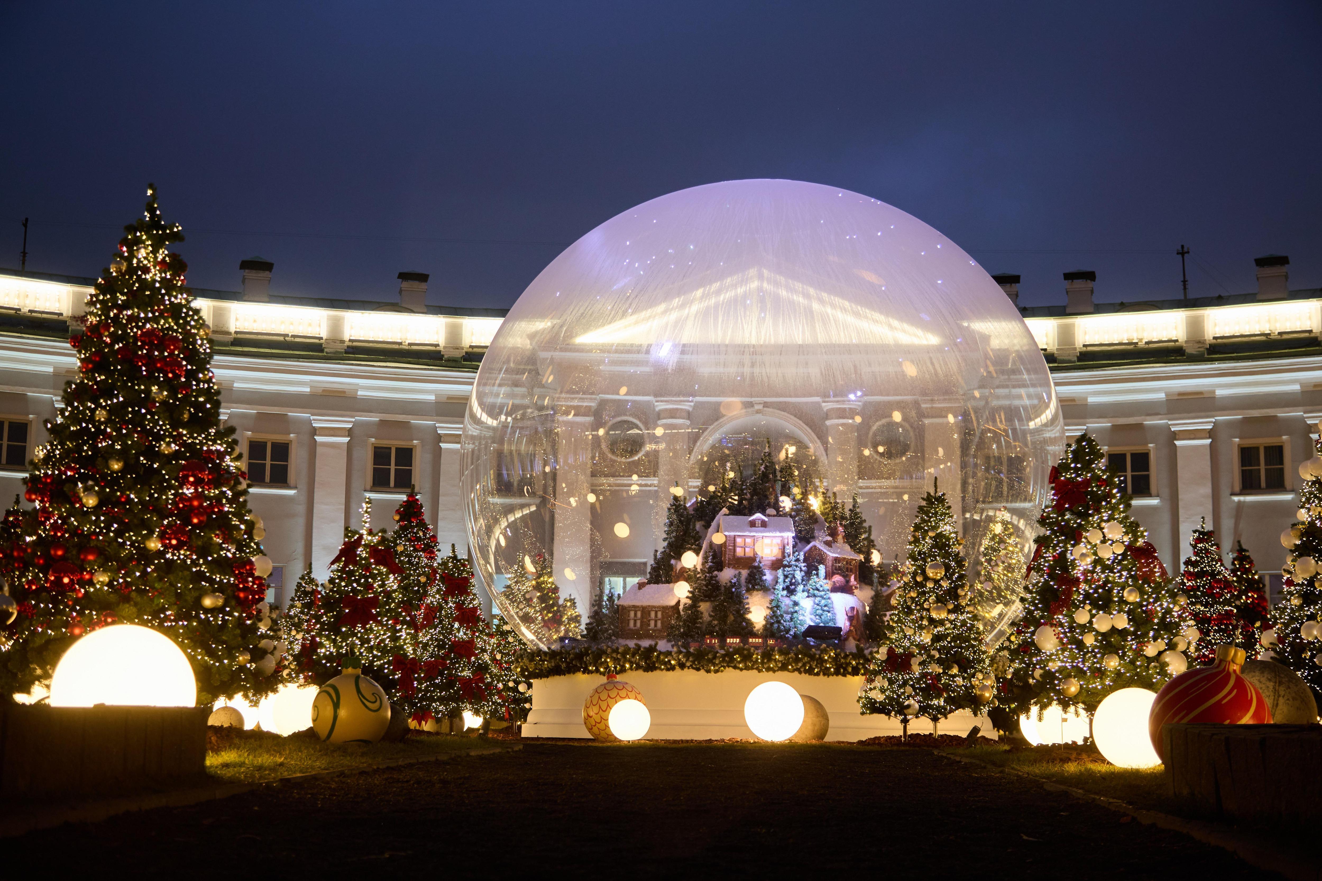 Яркая ель и светящиеся шары создают праздничную атмосферу.
