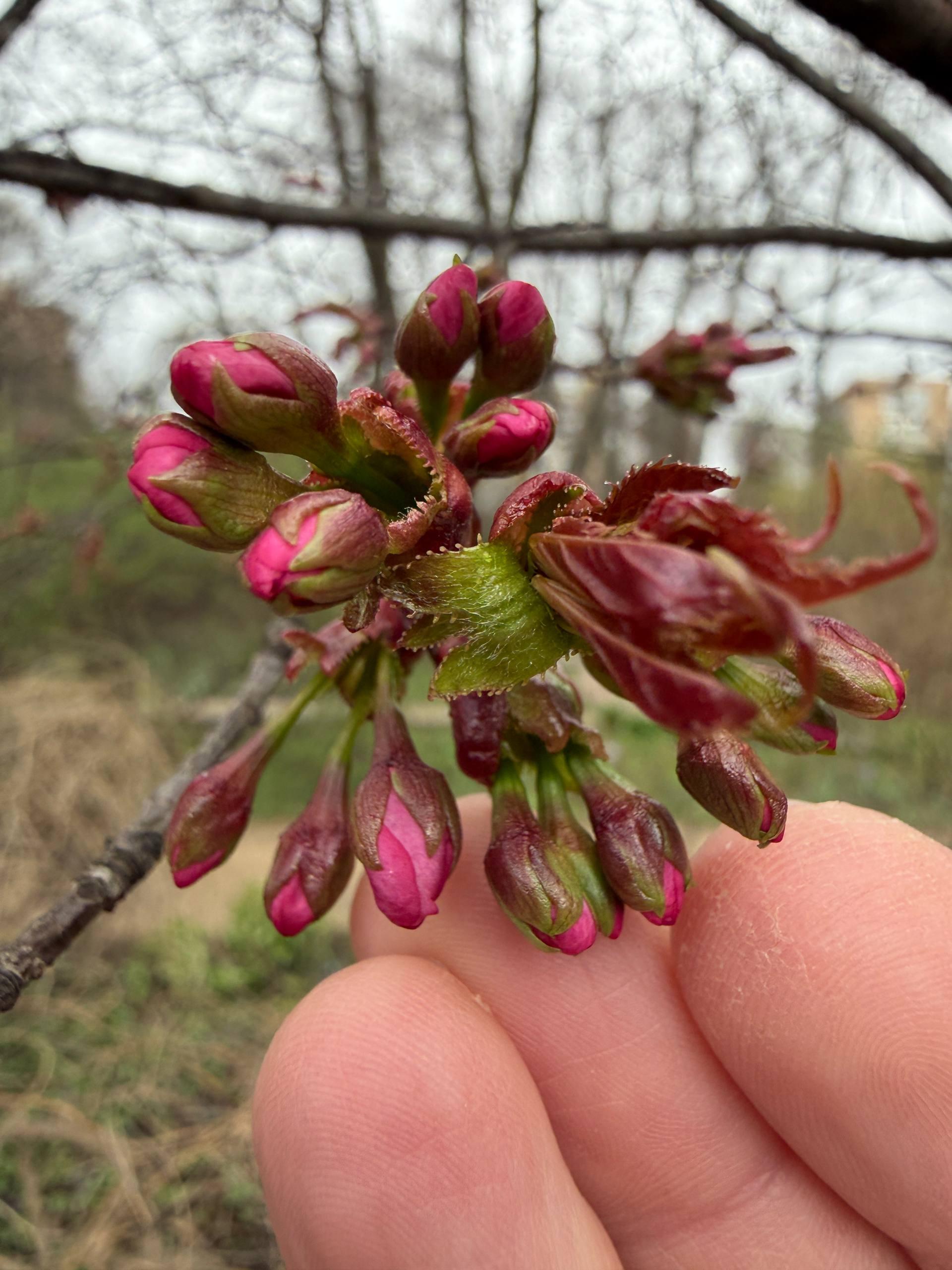 Еще одна сакура в саду пока не раскрыла бутоны, цветение ожидается после повышения температуры.