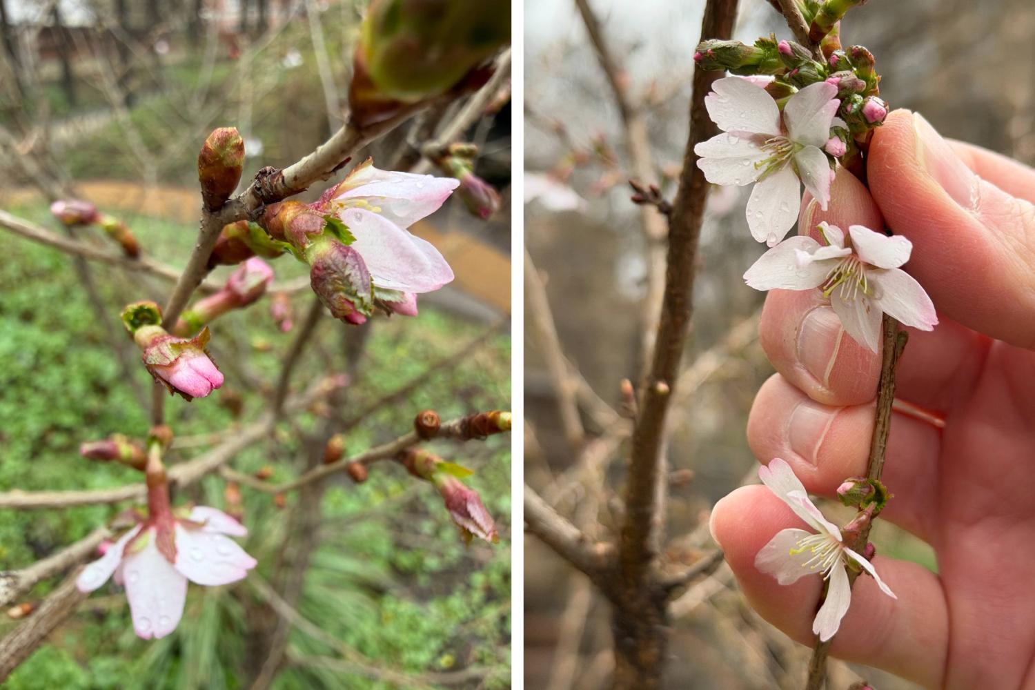 В Ботаническом саду МГУ зацвела первая сакура, а другое дерево пока не распустилось из-за похолодания.