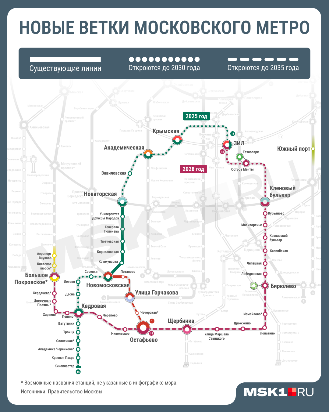 В границах Новой Москвы на схеме отмечены станции «Улица Маршала Савицкого», «Щербинка» и «Остафьево» с пересадкой на красную ветку. Их строительство предполагается завершить до 2034 года.