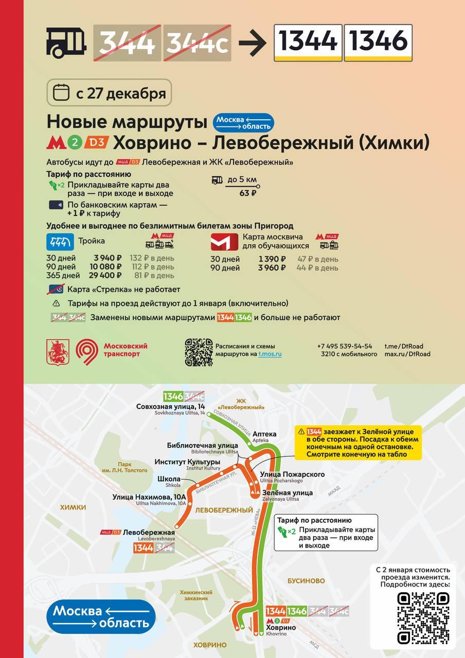 Автобусы маршрута 1344 будут следовать до станции МЦД-3 «Левобережная», проезжая по Зеленой и Левобережной улицам. Пассажиры маршрута 1346 смогут доехать до Совхозной улицы в ЖК «Левобережный».