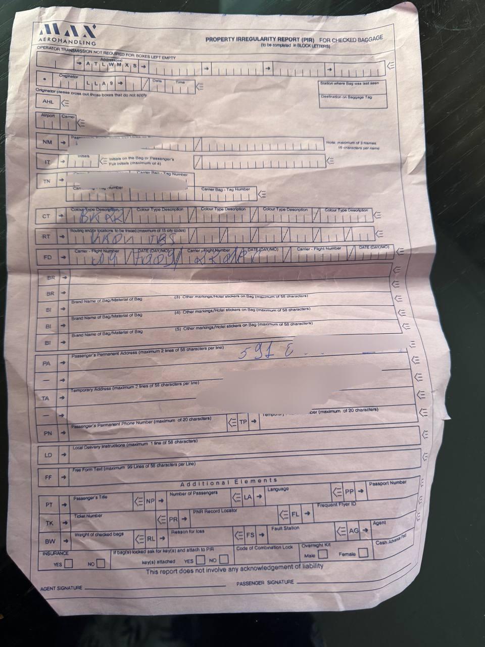 Документ, заполненный пассажирами в аэропорту Тбилиси для розыска багажа