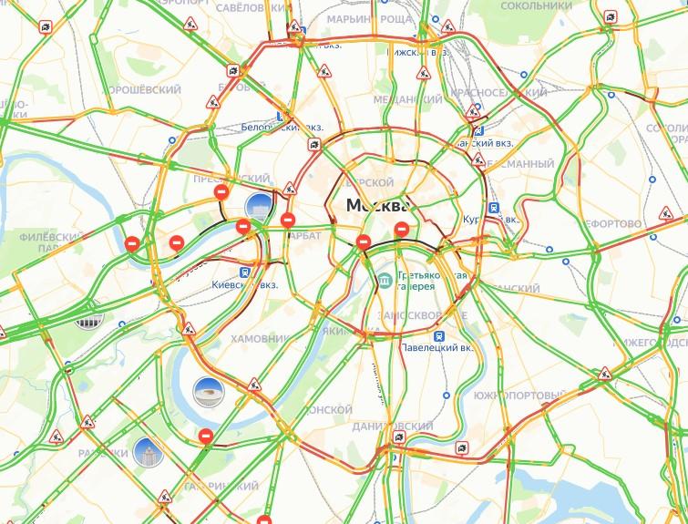 Крупномасштабные ограничения движения введены в центральной части Москвы. Согласно данным картографического сервиса, уровень загруженности дорог достиг шести баллов. Автомобилисты сообщают о вынужденных простоях продолжительностью более часа.
