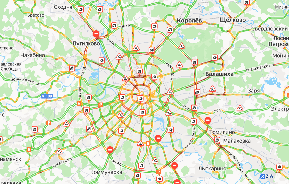 Въезд в город также затруднён: движение на шоссе Энтузиастов со стороны Балашихи и на Ленинградском шоссе из Химок отмечено как крайне интенсивное. Положение усугубляется локальными дорожно-транспортными происшествиями.