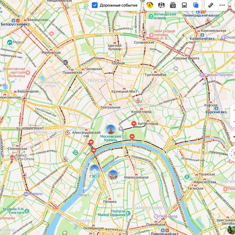 Пользователи сервиса «Яндекс Карты» в обсуждениях отмечают, что не могут выехать из пробки, образовавшейся у Кремля.