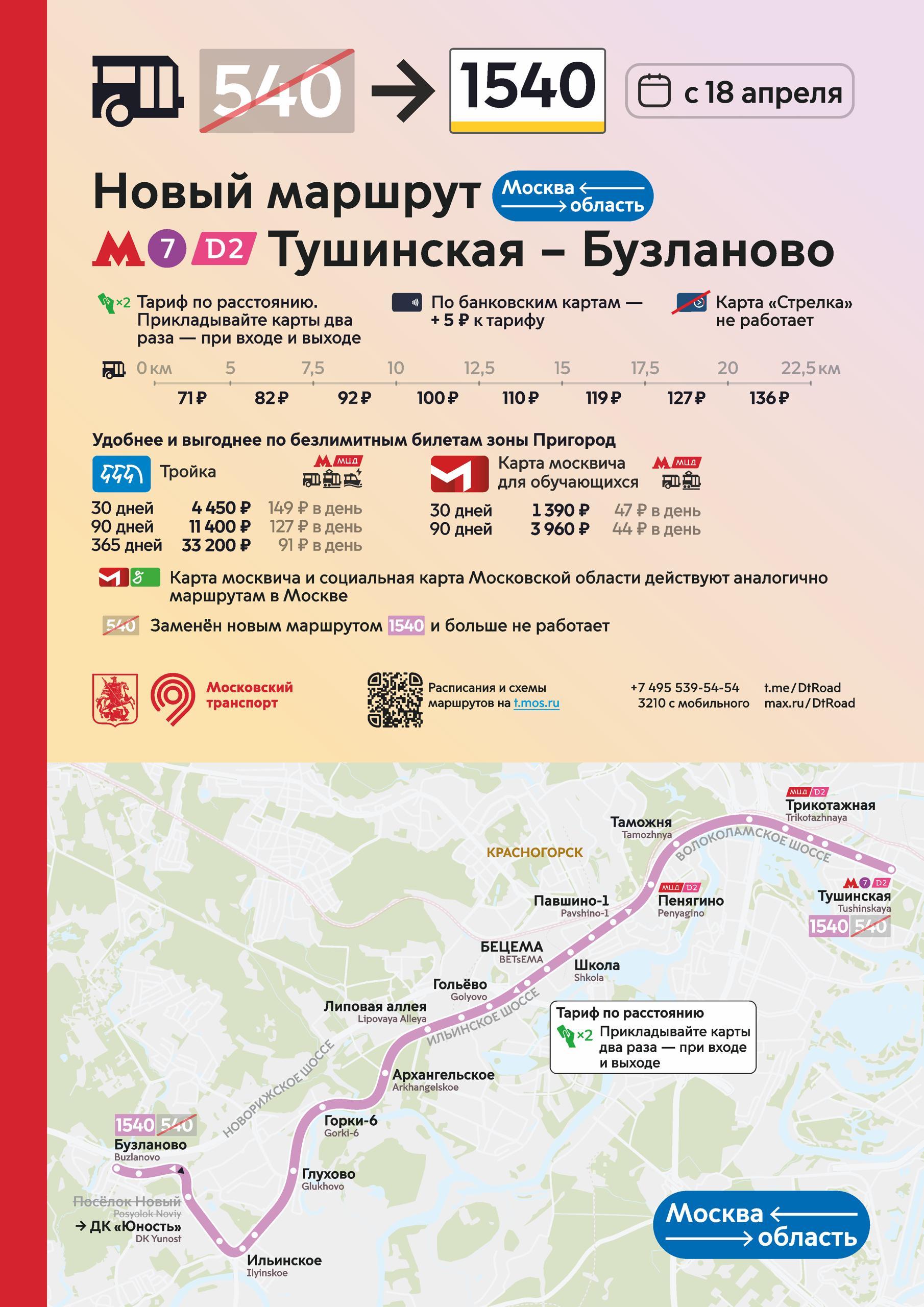 С 18 апреля начнет работу автобусный маршрут №1540, связывающий станцию метро «Тушинская» с поселком Бузланово в городском округе Красногорск. Обслуживание осуществляет столичный перевозчик.