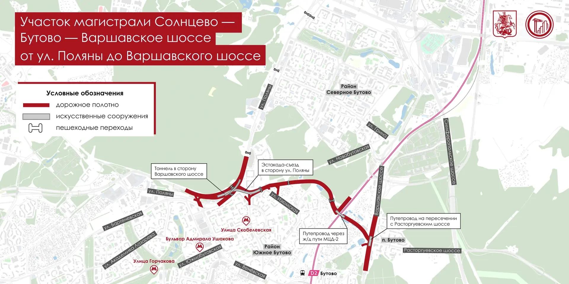 Мэр Москвы Сергей Собянин заявил, что трассу Солнцево — Бутово — Варшавское шоссе достроят в текущем году. После ввода в эксплуатацию финального участка от улицы Поляны до Варшавского шоссе транспортная ситуация улучшится для жителей Южного и Северного Бутово, где проживают более 300 тысяч человек. Также появится комфортный прямой выезд на Варшавское шоссе.