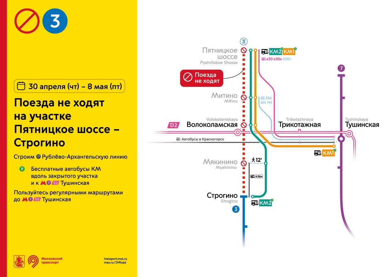 С 30 апреля по 8 мая в Москве закроют для пассажиров четыре станции Арбатско-Покровской линии метро: «Мякинино», «Волоколамская», «Митино» и «Пятницкое шоссе». В этот период добираться придётся на наземном транспорте и поездах МЦД.