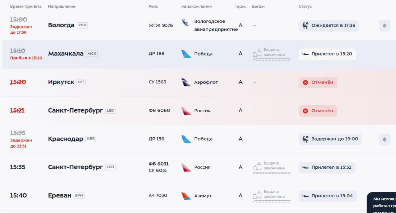 Согласно данным онлайн-табло аэропорта, уже зафиксированы задержки и отмены ряда рейсов как на прибытие, так и на вылет.