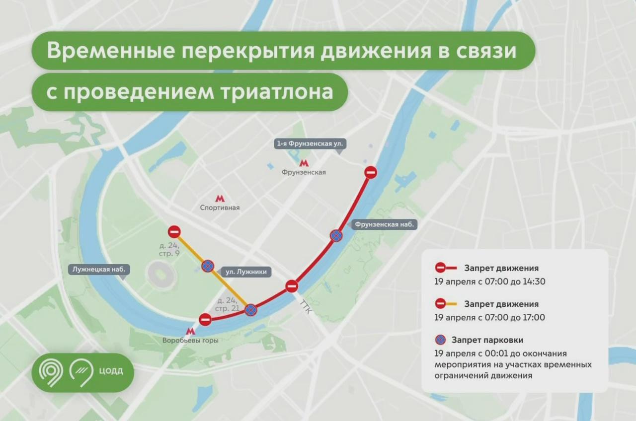 Участок улицы Лужники от дома 24с9 до Лужнецкой набережной перекроют с 07:00 до 17:00. Парковка на всех этих участках будет запрещена с 00:01 19 апреля до окончания мероприятия.