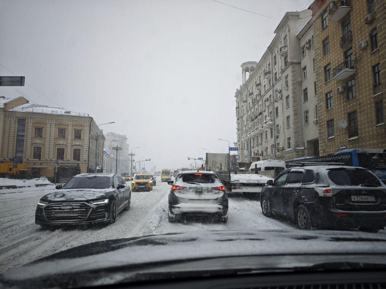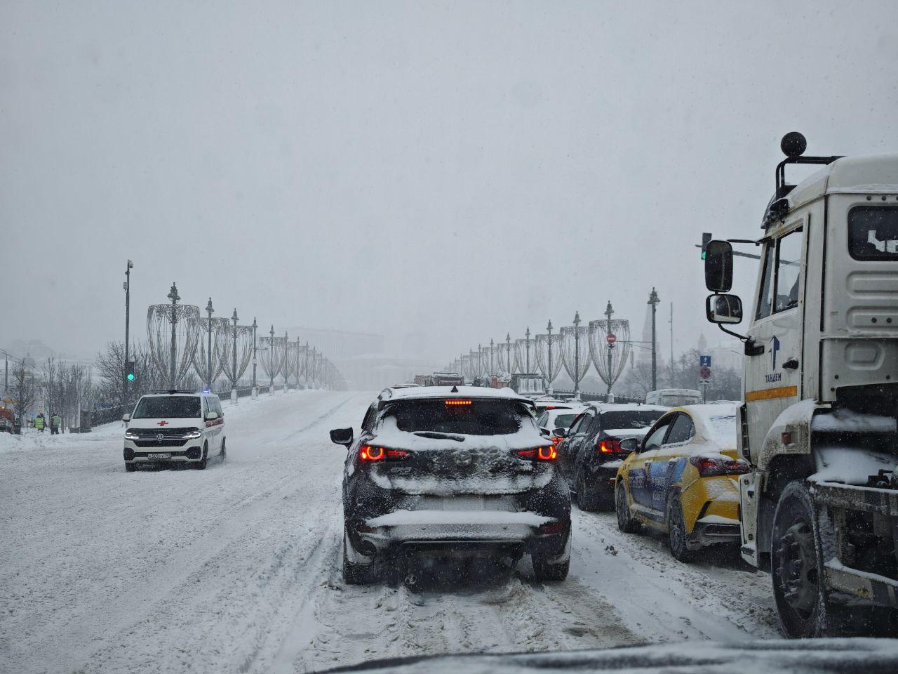 Центр Москвы столкнулся с масштабными пробками из-за метели и дорожных ограничений. Движение у Кремля полностью перекрыто.