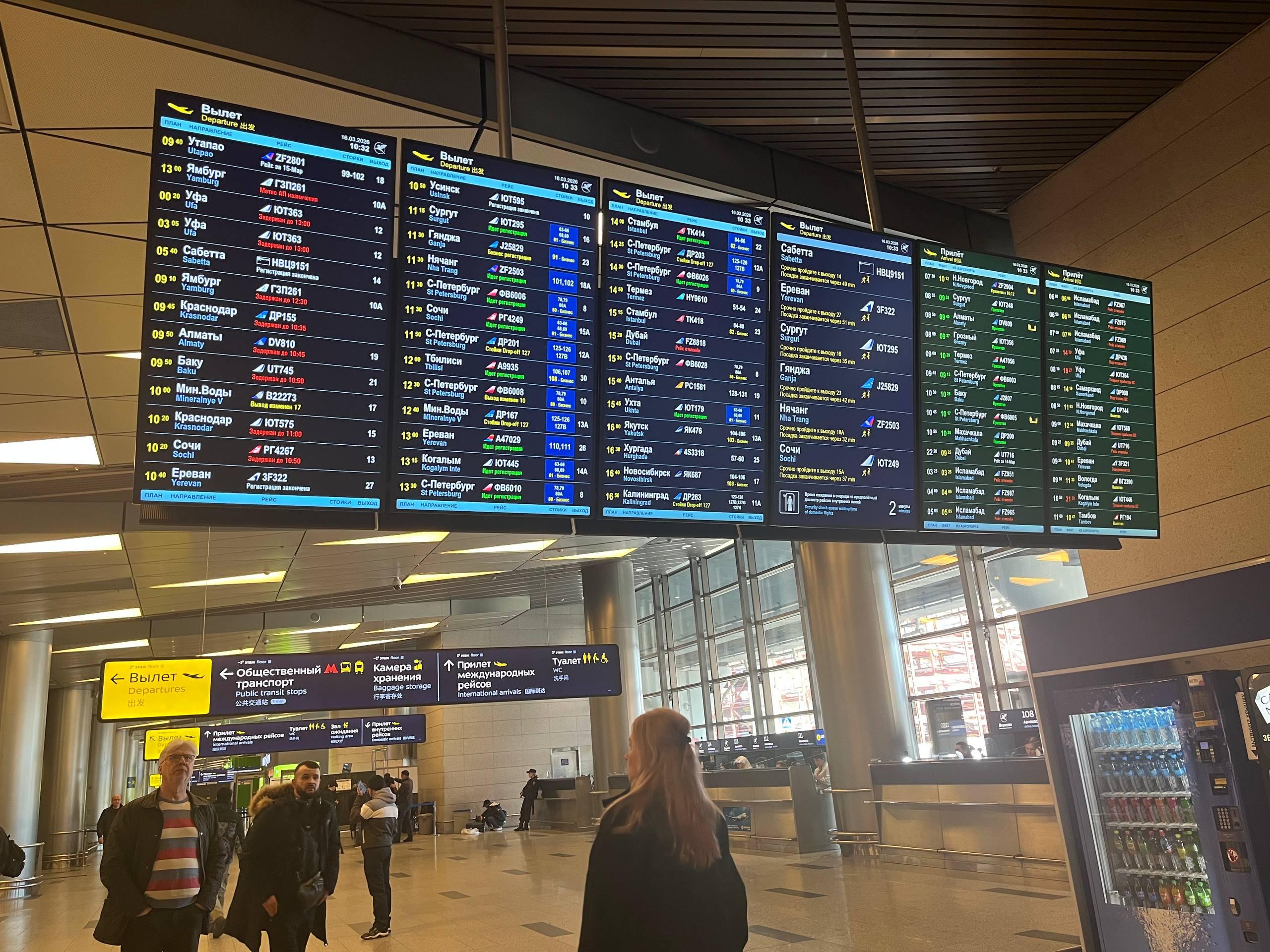Пассажирка Маргарита сообщает, что в Внуково нет больших скоплений людей, но информационные табло отображают множество задержек. «Половина табло красное и на прилет, и на вылет. Особых толп нет — только у стоек авиакомпаний, где билеты можно обменять», — отметила она.