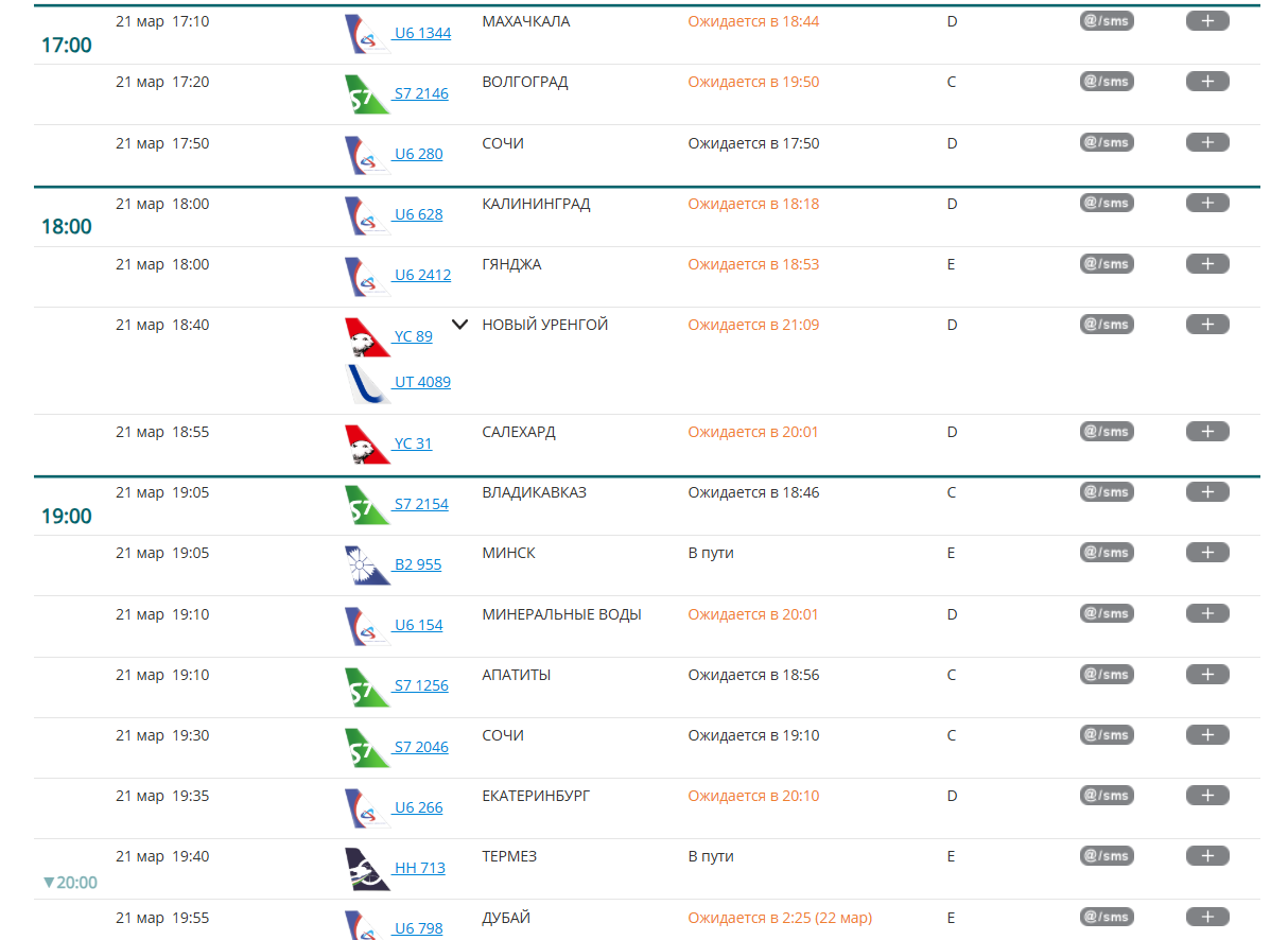 - Самолёты из Калининграда, Махачкалы, Сочи, Салехарда, Екатеринбурга и Минеральных Вод (второй рейс с 17:00) задерживаются на полтора часа.