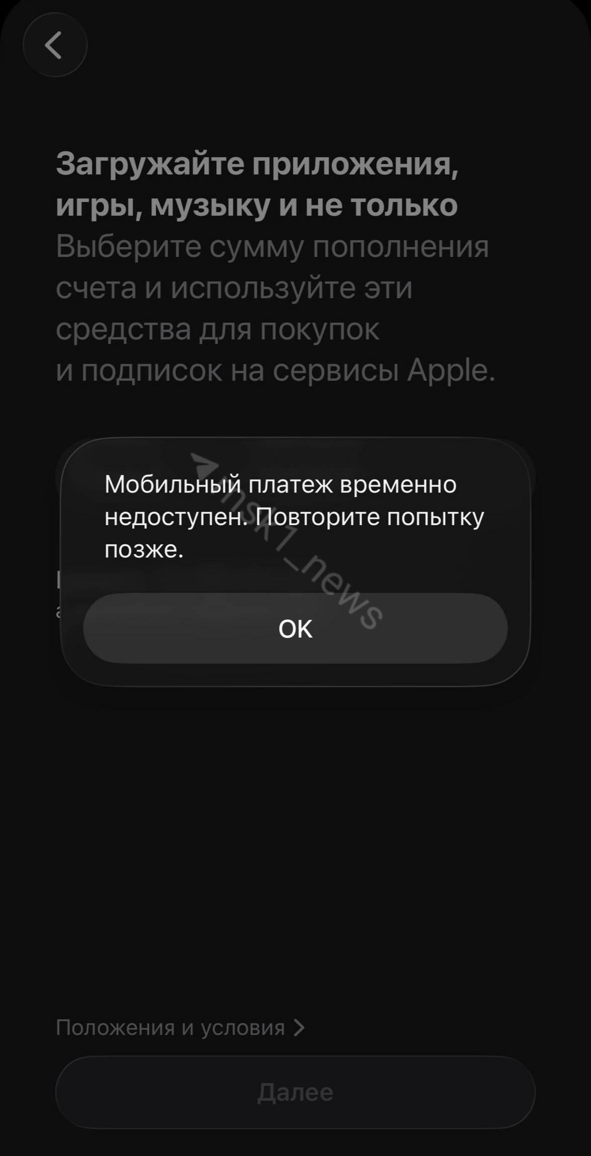 При попытке совершить платеж в AppStore теперь отображается сообщение: «Мобильный платеж временно недоступен. Повторите попытку позже».