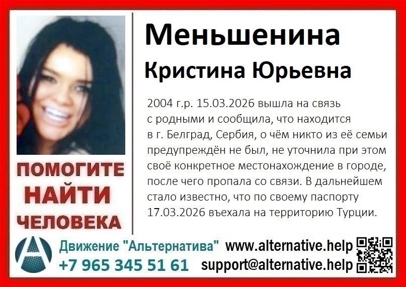 Мать 21-летней Кристины Меньшениной из подмосковного Одинцово сообщила о её исчезновении за рубежом. Девушка отправилась в Сербию через Турцию в конце февраля, а с 17 марта перестала подавать признаки жизни.